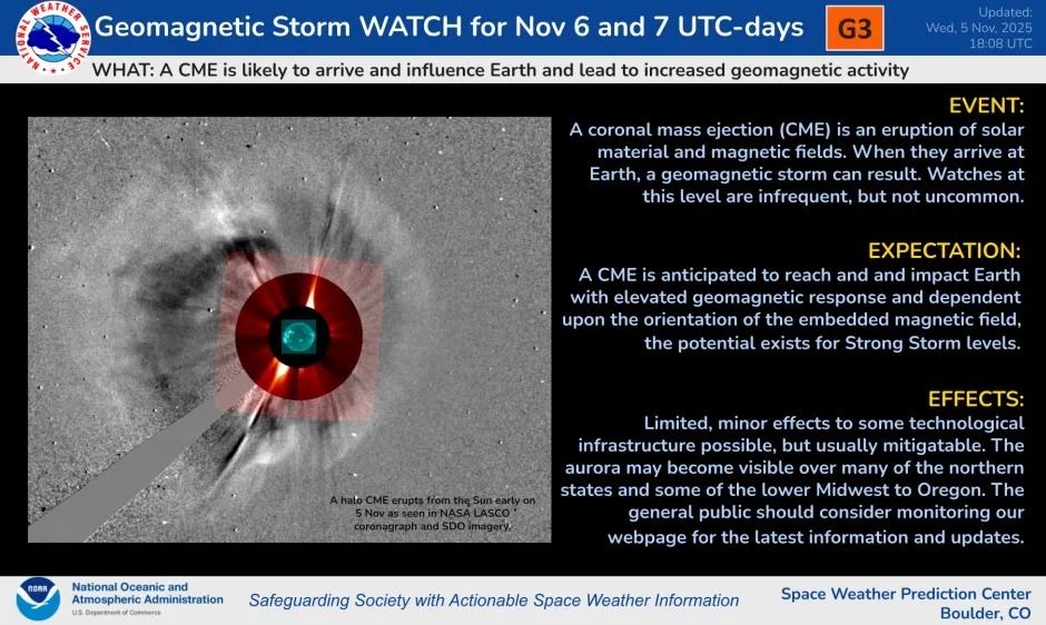 В течение ночи 5 ноября на Земле зафиксировали мощную геомагнитную бурю, которая неожиданно для синоптиков достигла сильного уровня G3. По данным Центра прогнозирования космической погоды NOAA, это, вероятно, произошло из-за сочетания коронального выброса массы (CME), что задел планету, с остатками потока высокоскоростного солнечного ветра. Результатом стала интенсивная активность полярных сияний, которые наблюдали в Европе, Канаде и на севере США.