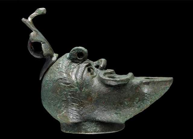 - В области бороды сделано отверстие для фитиля, а рельефно очерченный и широко открытый рот имеет отверстие для масла.