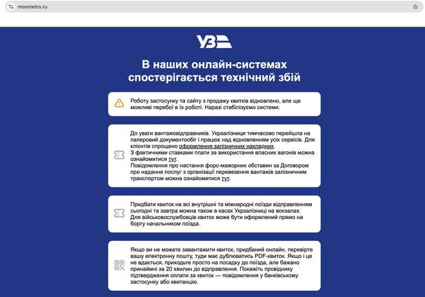 Кроме того, при попытке зайти на сайт метро Москвы все пользователи направляются на оповещение от "Укрзализныци" о сбое в системе, рассказывает 24 Канал.