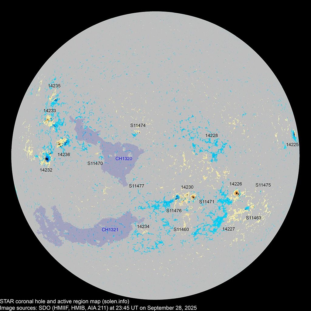 Карта солнечных пятен и корональных дыр по состоянию на 29 сентября 2025 года / Фото SDO/solen.info