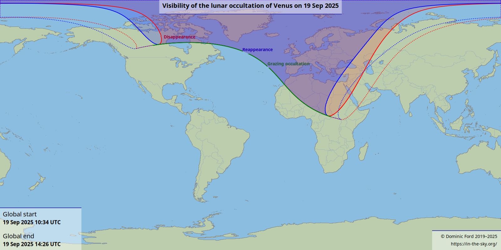 Это изображение показывает территорию, где можно будет наблюдать окультацию, покрытия Венеры Луной / Фото In-The-Sky.org