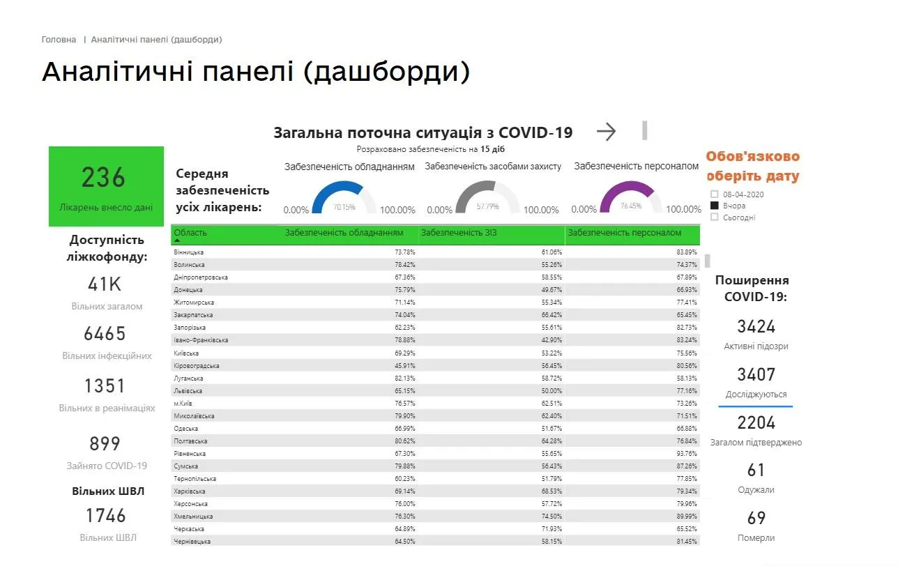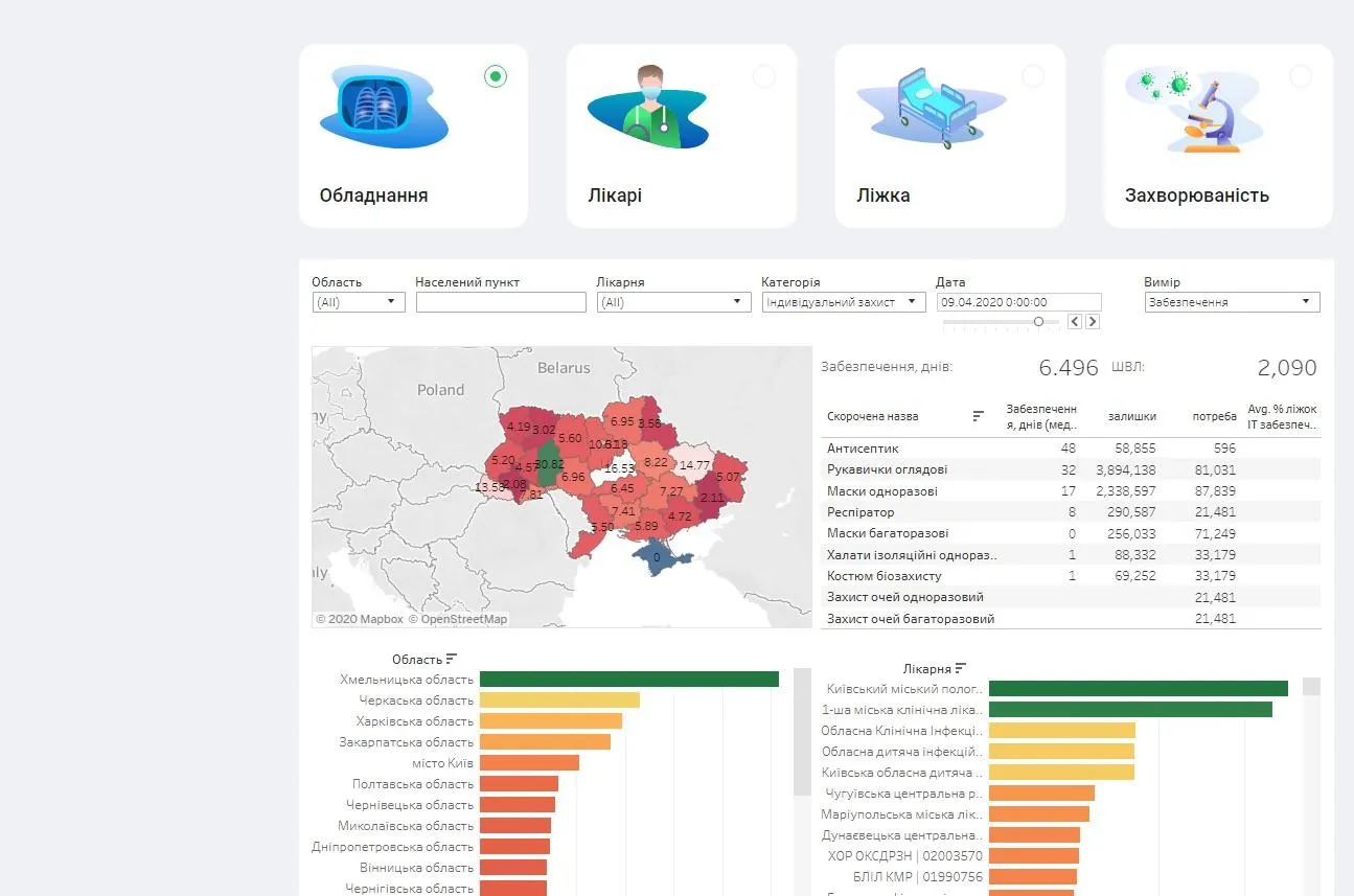 Он информирует об обеспеченности медицинских учреждений необходимыми ресурсами. Можно просмотреть информацию о больницах, койкоместах, свободных аппаратах ИВЛ, средствах индивидуальной защиты, медицинском персонале и тому подобное. Причем можно смотреть по каждой области или больнице отдельно.