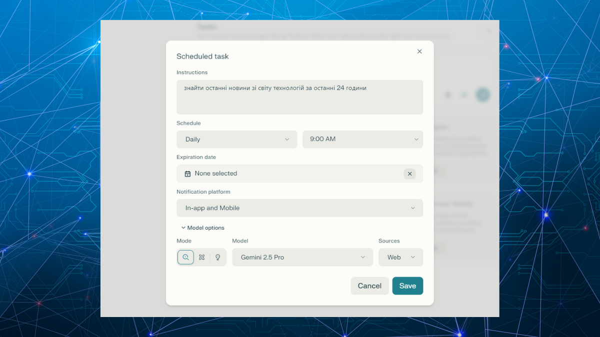 Чтобы создать задание, нужно перейти в свой профиль, выбрать Tasks, написать запрос (например, "найти последние новости из мира технологий за 24 часа") и установить время выполнения.