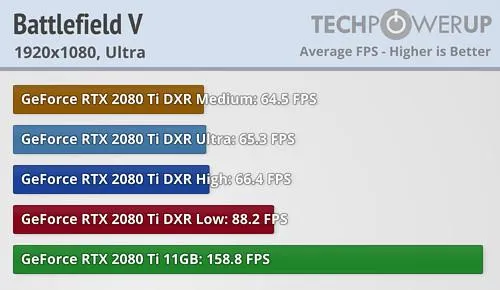 В режиме DXR RayTrace Reflections с максимальным качеством трассировки при разрешении Full HD (1920 х 1080 пикселей) производительность видеокарты GeForce RTX 2080 Ti по частоте кадров снизилась более чем в два раза.