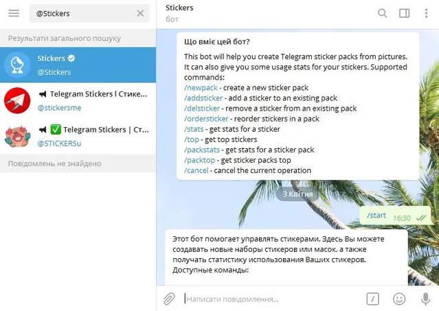 Стикеры – это картинки, которые по идее похожи на смайлики. Telegram позволяет пользователям как бесплатно использовать уже готовые наборы стикеров, так и создавать их самим. Для этого необходимо написать боту @stickers и следовать его инструкциям.