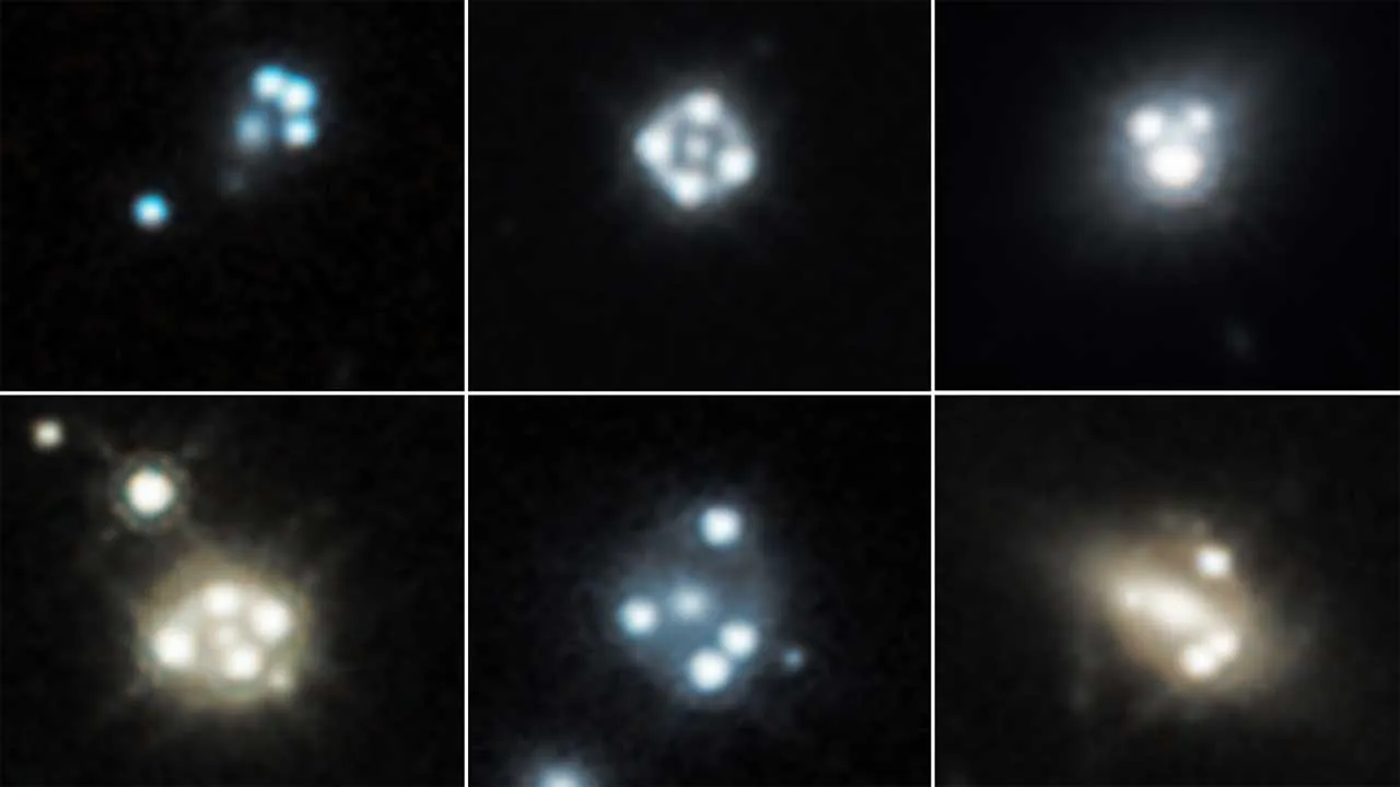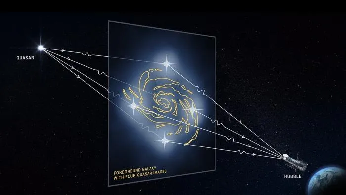 Благодаря этому удалось обнаружить скопление темной материи вдоль линии обзора, а также внутри и вокруг галактик. Команда отмечает, что восемь квазаров и галактик были выровнены достаточно точно, чтобы эффект искажения дал четыре изображения каждого квазара.