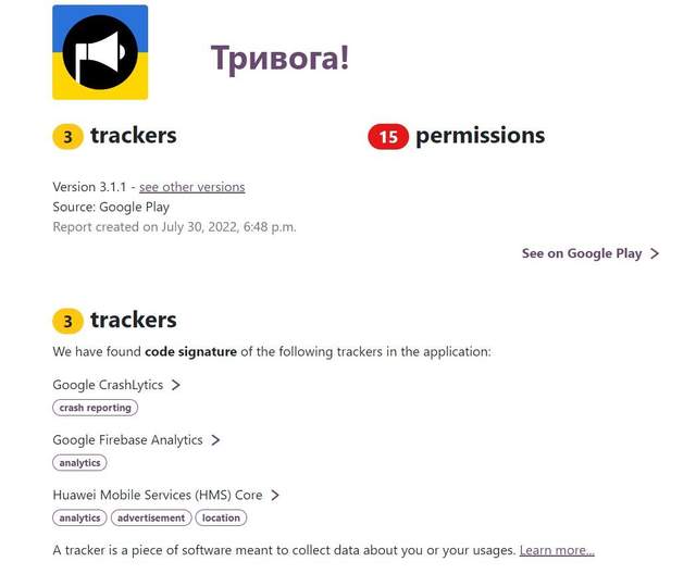 Вставляем в строку поиска ссылку на страницу "Воздушная тревога" в Google Play и обнаруживаем, что эта популярная программа имеет 3 встроенных трекера и спрашивает у нас 15 разрешений. Если мы не уверены в конкретном трекере, мы всегда можем найти его в Google или зайти на официальный веб-сайт и проверить, безопасен он или нет.