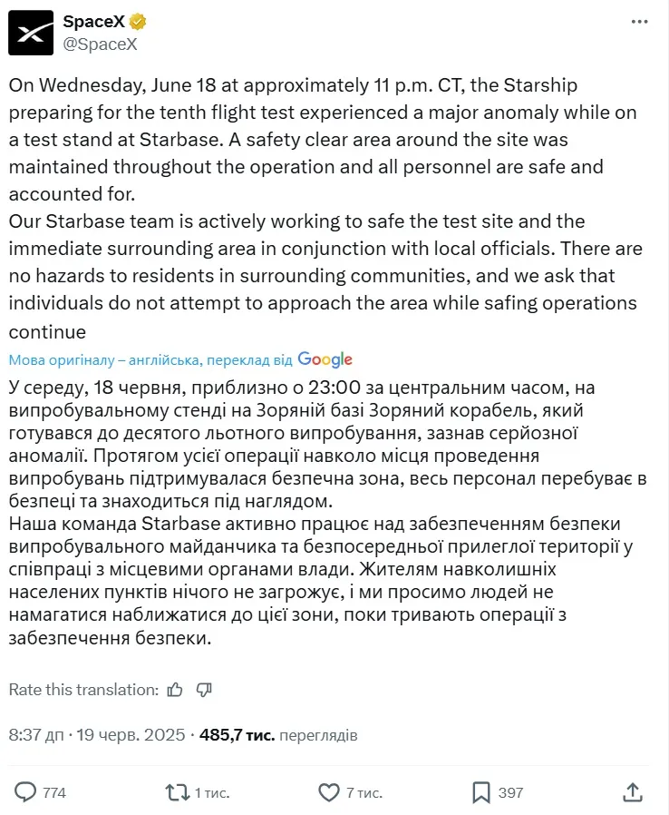 SpaceX опубликовала заявление на платформе X через 90 минут после события, подтвердив, что "корабль Starship, который готовился к десятому тестовому полету, потерпел серьезную аномалию на тестовом стенде в Starbase".