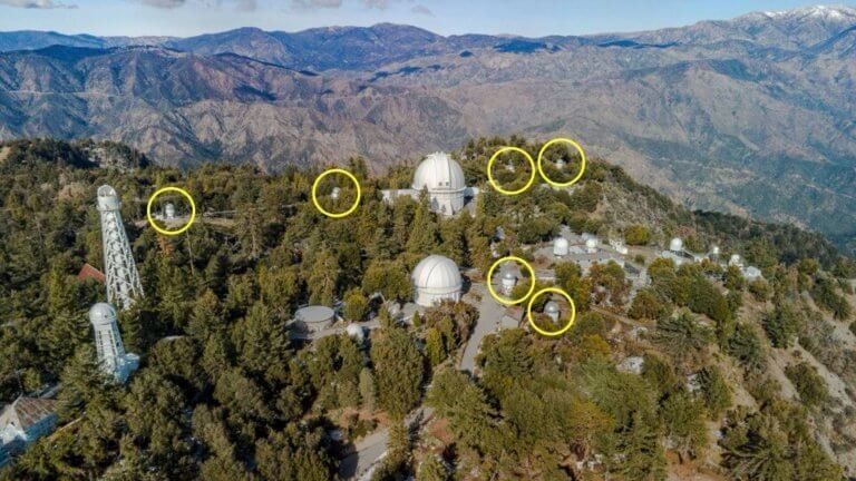 Круги обозначают купола шести телескопов CHARA Array в обсерватории Маунт-Вилсон / Фото Университета штата Джорджия
