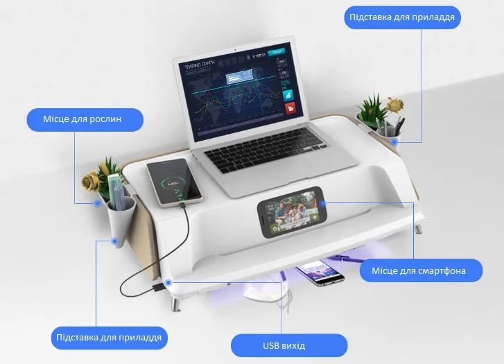 С обеих сторон расположены "стаканы", где можно хранить канцелярию. В подставке также есть разъем USB для зарядки смартфона, планшета и других гаджетов. В самом же низу находится пустое пространство с ультрафиолетовыми лампами, куда можно класть смартфон и другие вещи для стерилизации. Процесс очистки от бактерий занимает всего 10 минут, после чего лампы автоматически выключаются.