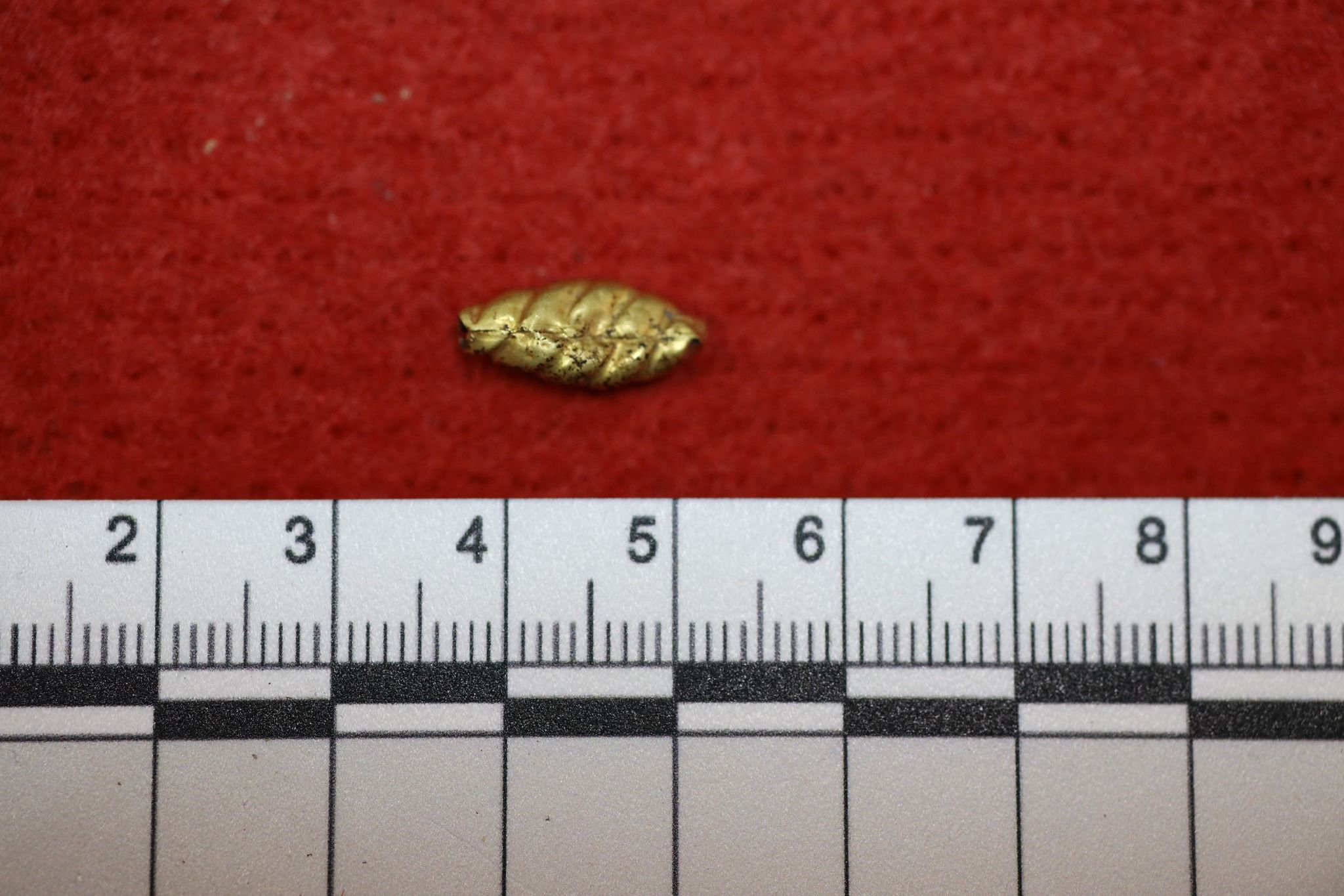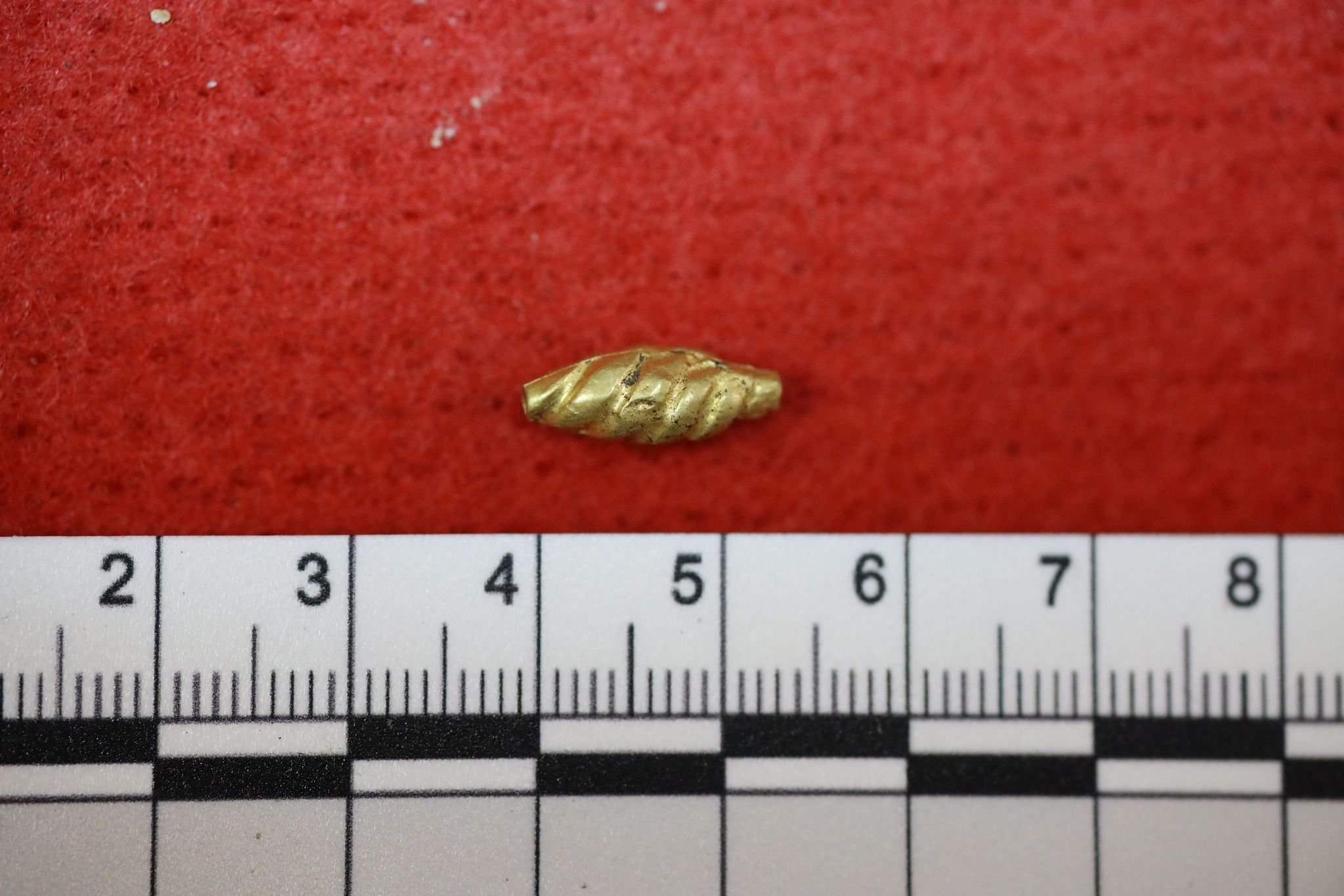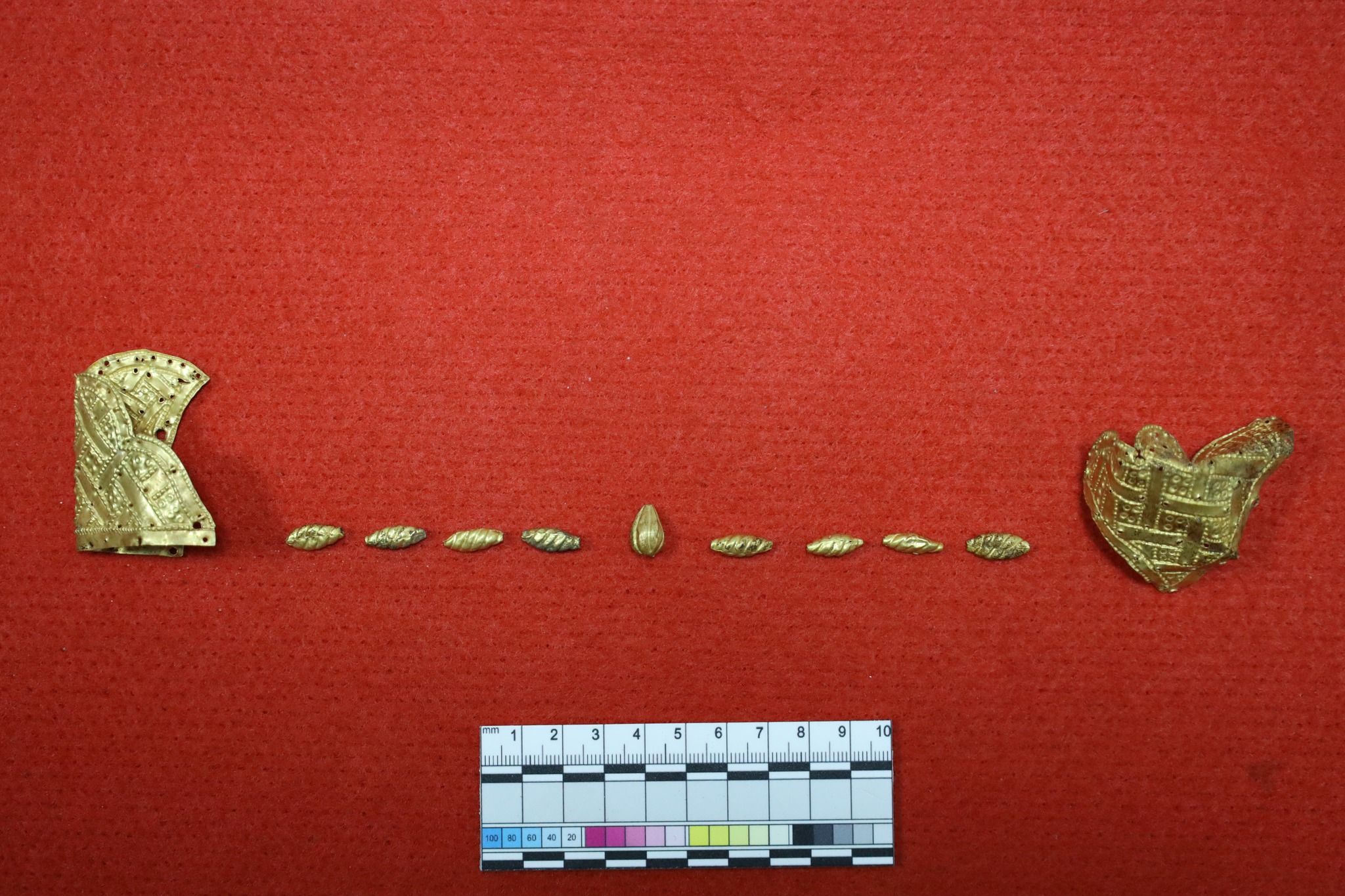 Всего коллекция состоит из 12 золотых предметов общим весом около 28 граммов и перламутрового бисера. Их нашли спрятанными в небольшом керамическом сосуде.
