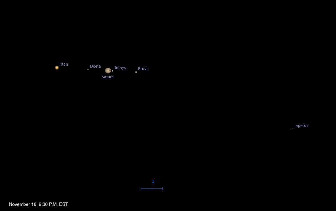 - 16 ноября можно будет наблюдать Сатурн и его спутники, в частности Япет, который достигнет максимальной яркости.