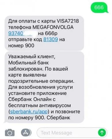 Автор блогу "Палач" Павло Городницький відправив на сервісний номер банку число "666" для поповнення мобільного рахунку на відповідну суму, але у відповідь отримав повідомлення про блокування "Мобільного банку" через здійснення підозрілих операцій. Для відновлення роботи послуги йому запропонували встановити фірмовий додаток "Сбербанк Онлайн" з вбудованим антивірусом і зв'язатися з співробітниками банку.