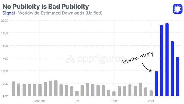 Після скандалу з витоком даних, коли редактор The Atlantic Джеффрі Голдберг був доданий до групового чату, де високопосадовці адміністрації Трампа обговорювали атаку на хуситів у Ємені, завантаження зашифрованого месенджера Signal різко зросли. Розголос у пресі щодо витоку цих конфіденційних планів спонукав багатьох людей уперше ознайомитися з сервісом.