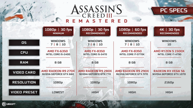 Системні вимоги до гри Assassin's Creed III Remastered опублікували в мережі