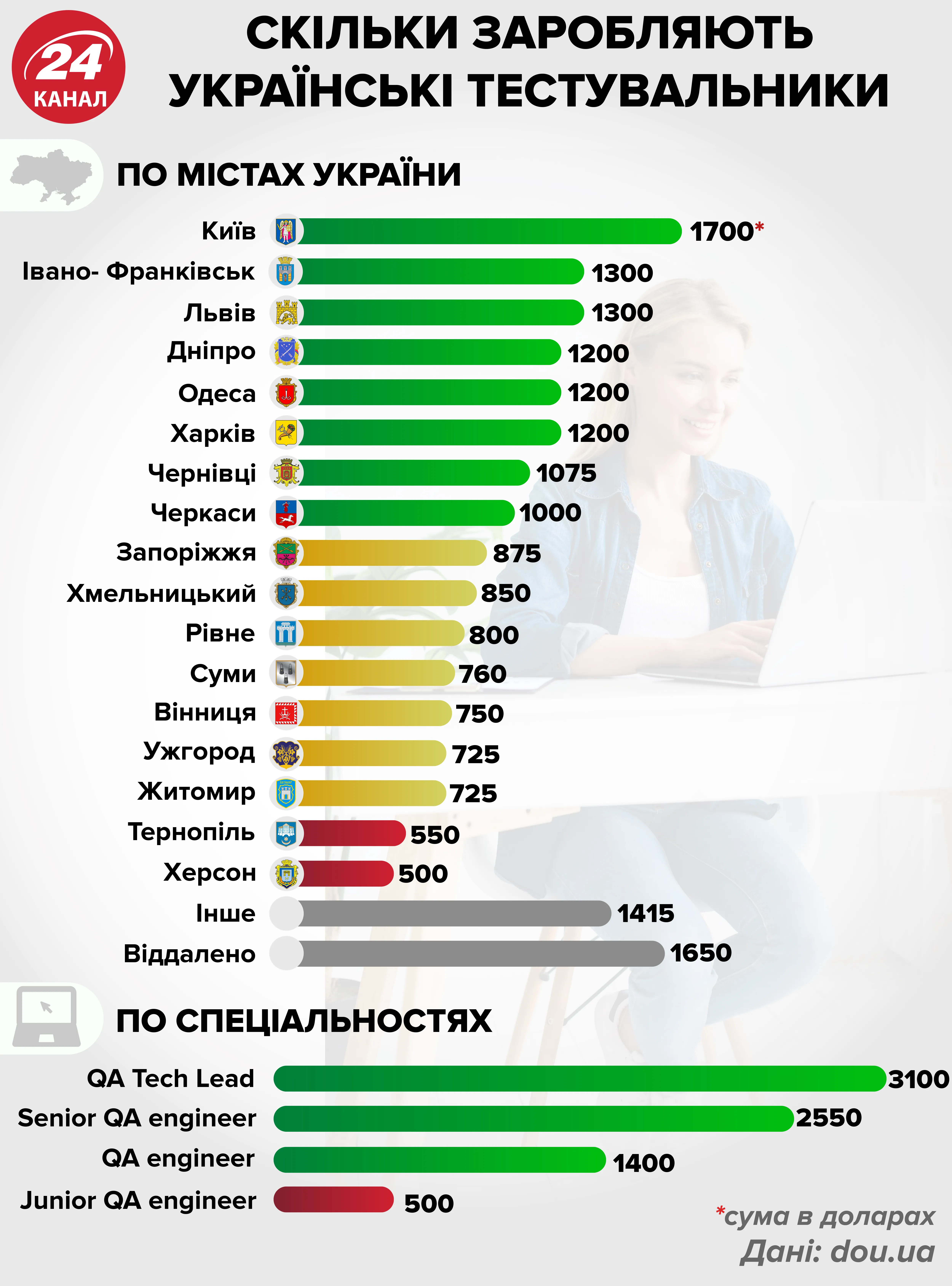 Загалом, у Києві найвищі зарплати серед тестувальників практично усіх спеціалізацій. До прикладу, Senior у столиці отримують на 500 доларів більше, ніж у Львові й Харкові, та на 600 і 800 доларів більше, ніж в Одесі і Дніпрі відповідно.
