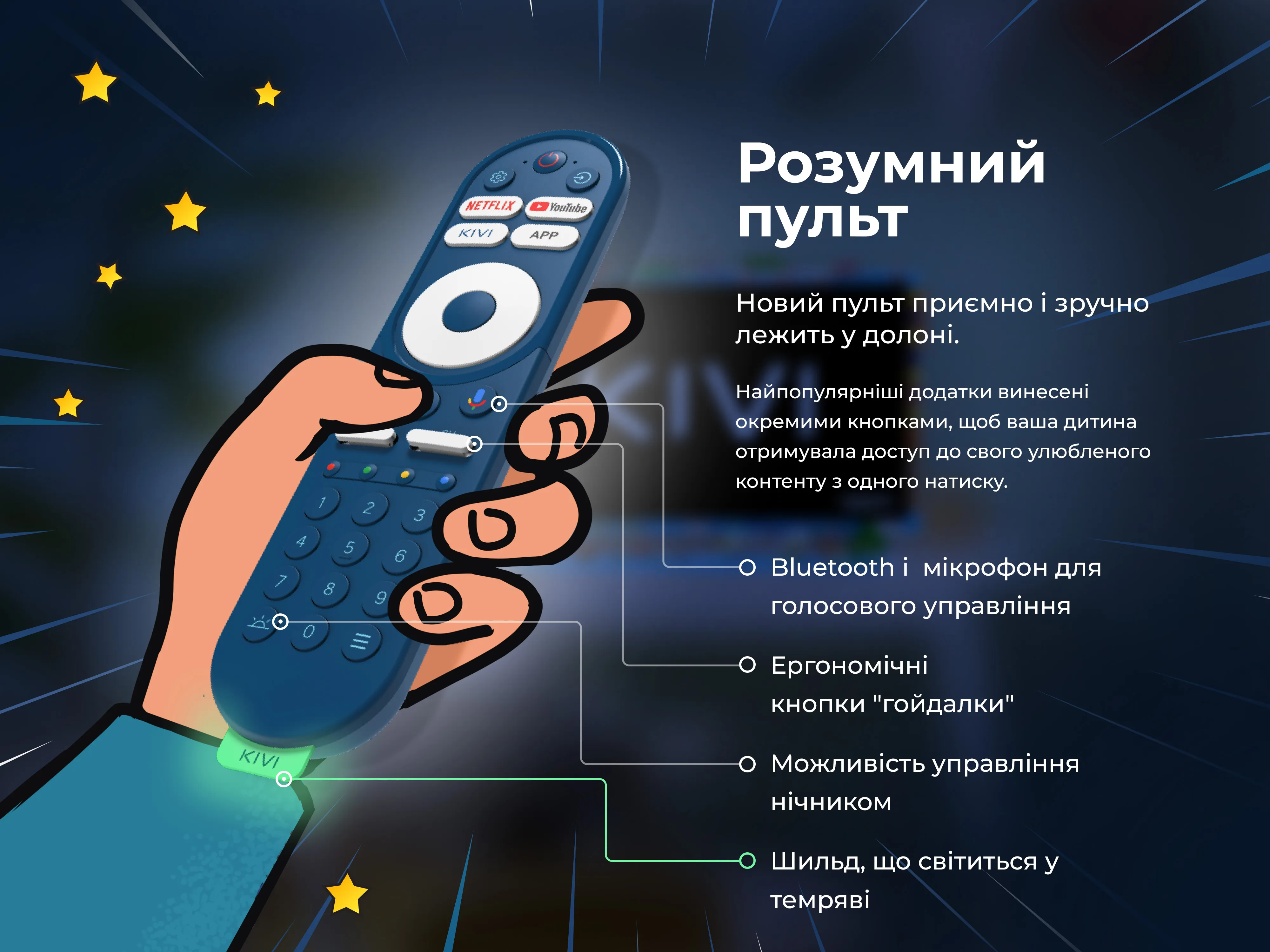 Оновлений пульт KIVI має ергономічний дизайн з мінімумом кнопок, щоб з управлінням Smart TV впоралася навіть дитина. Він приємно і зручно лежить у долоні, а кнопки мають плавний і тихий хід. В пульт вбудовано мікрофон, щоб управляти контентом могли навіть ті, хто ще не вміє читати. Найпопулярніші додатки винесені на пульт окремими кнопками для швидкої навігації.