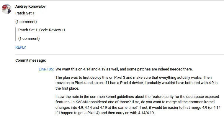 Зокрема, ентузіасти виявили в базі даних Android Open Source Project першу згадку смартфона Google Pixel 4. Коментар до майбутнього патчу для інструменту виявлення помилок пам'яті був залишений співробітником Google, який двічі згадав апарат.