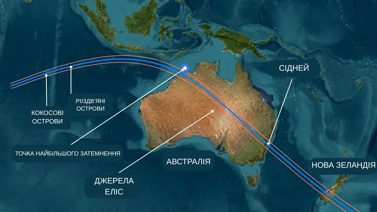 Затемнення розпочнеться на світанку в Індійському океані, пройде через Кокосові та Різдвяні острови, перетне Західну Австралію, Північну Територію, Квінсленд та Новий Південний Уельс, а завершиться над Тасмановим морем біля Нової Зеландії. Загальна тривалість події від першого до останнього контакту з суходолом складе 2 години 49 хвилин.