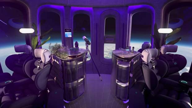 Капсула буде оснащена м'якими сидіннями, баром із закусками, системою зв'язку Wi-Fi з можливістю прямої трансляції, панорамними вікнами на 360 градусів і туалетом під палубою.
