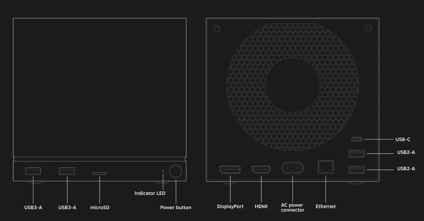 На ній розташовані два порти USB 3.0 та слот microSD, а ззаду – два USB 2.0, один USB-C та Ethernet. Пристрій підтримує Wi-Fi 6E, Bluetooth та може підключати до чотирьох контролерів Steam без адаптера.