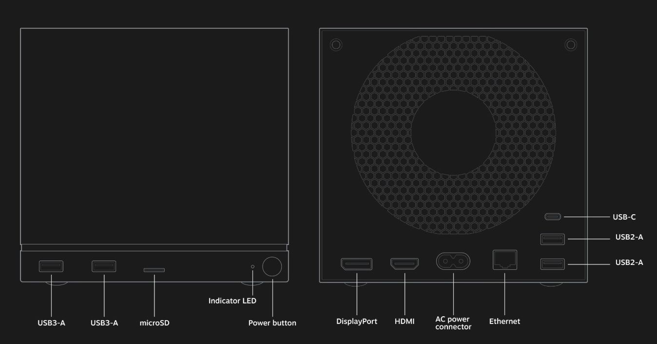 На ній розташовані два порти USB 3.0 та слот microSD, а ззаду – два USB 2.0, один USB-C та Ethernet. Пристрій підтримує Wi-Fi 6E, Bluetooth та може підключати до чотирьох контролерів Steam без адаптера.