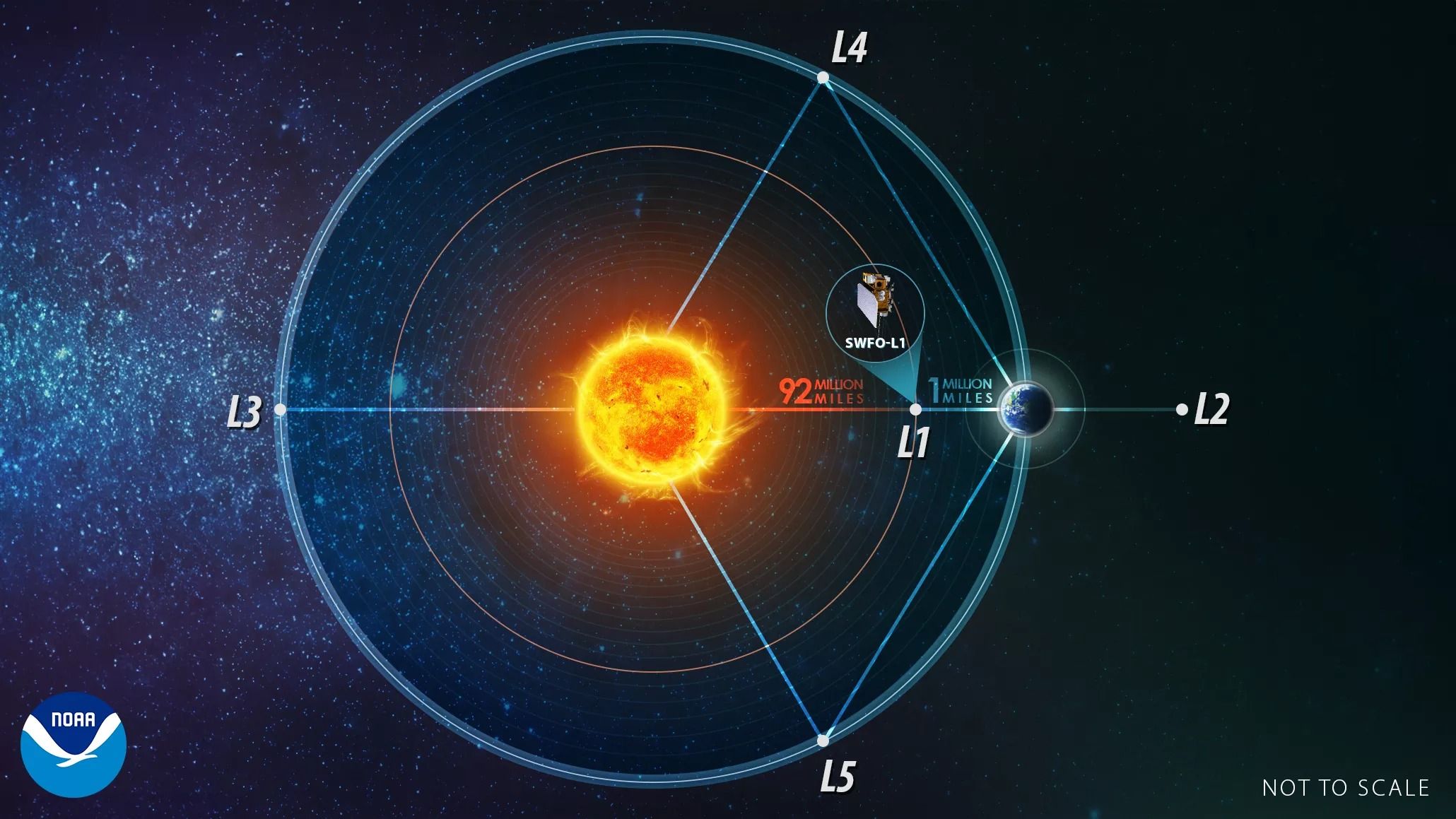 SOLAR-1 перебуває у точці Лагранжа L1, де сили тяжіння Землі та Сонця взаємно компенсують одна одну, дозволяючи космічним апаратам лишатися в стабільному положенні нескінченно довго й не потребувати корегування орбіти / Фото NOAA