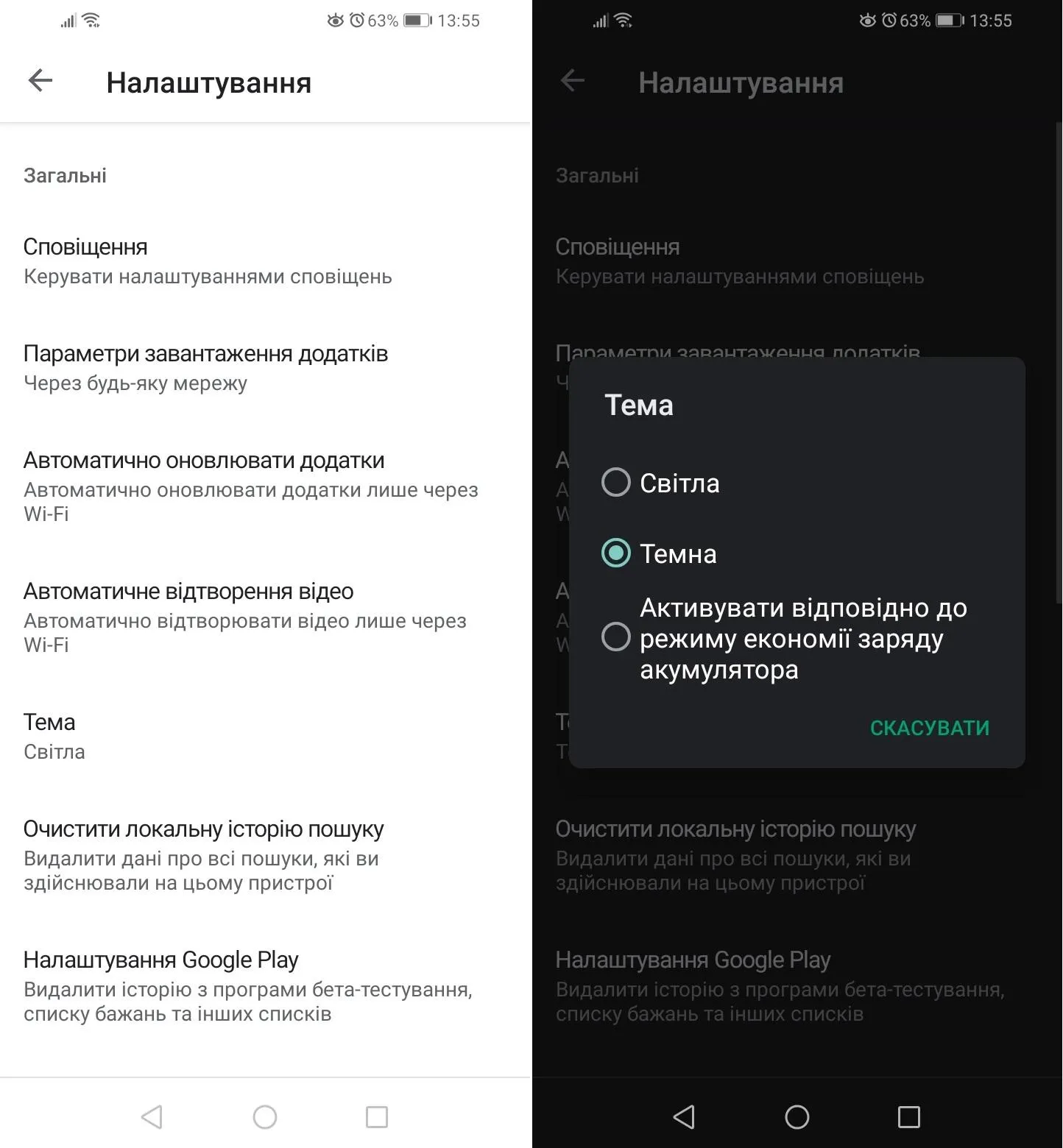 Щоб активувати нічну тему в Google Play, запустіть на пристрої сам каталог: