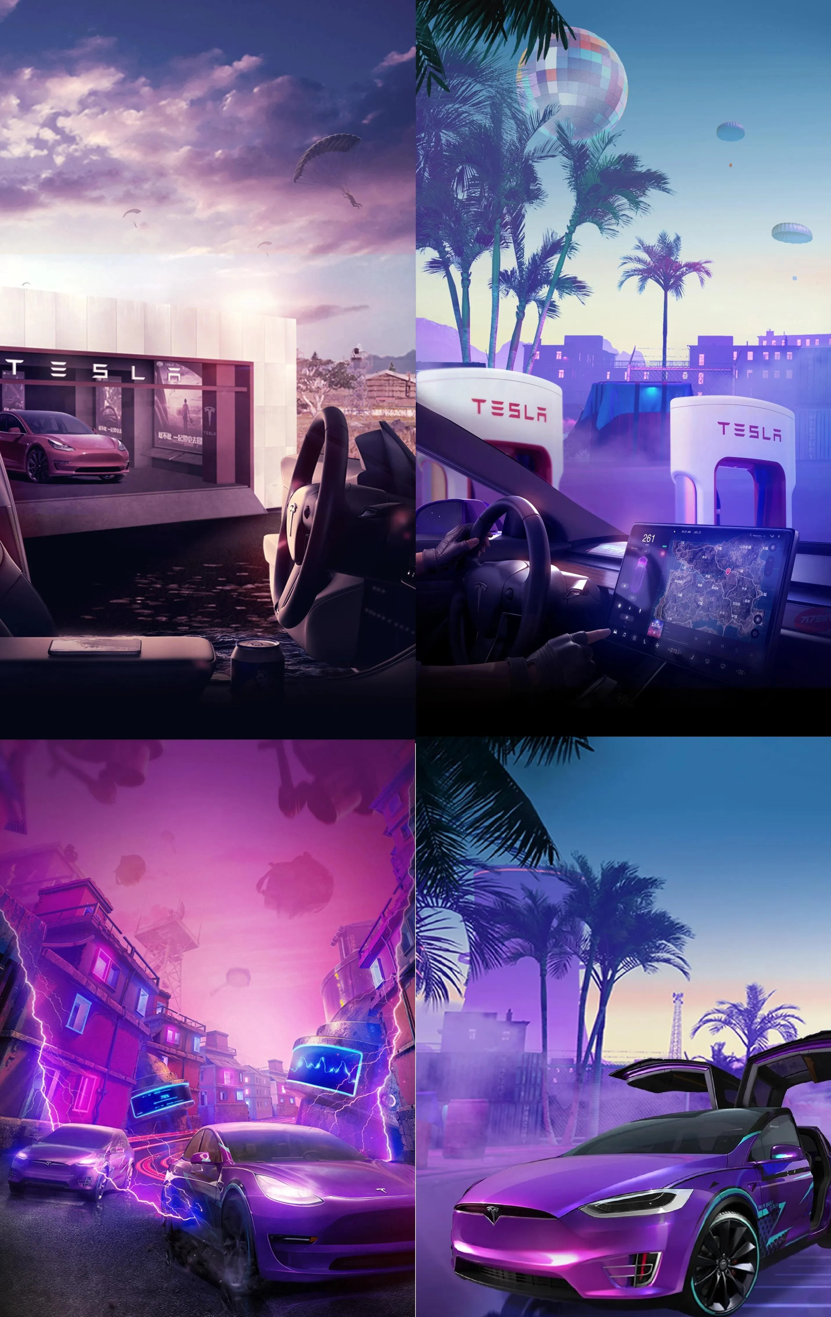 На картинках показаний вид з вікна автомобіля Tesla на офіційний салон компанії, «двері-крила» готується до серійного виробництва Tesla Model Y, величезний планшет в салоні Model 3 з видом на зарядні станції SuperCharge, а також два автомобілі бренду на тлі неонової атмосфери.