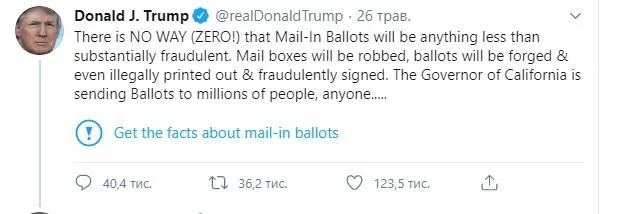 Попередження з'явилося під постом Трампа про те, що поштове голосування може призвести до масштабних фальсифікацій.
