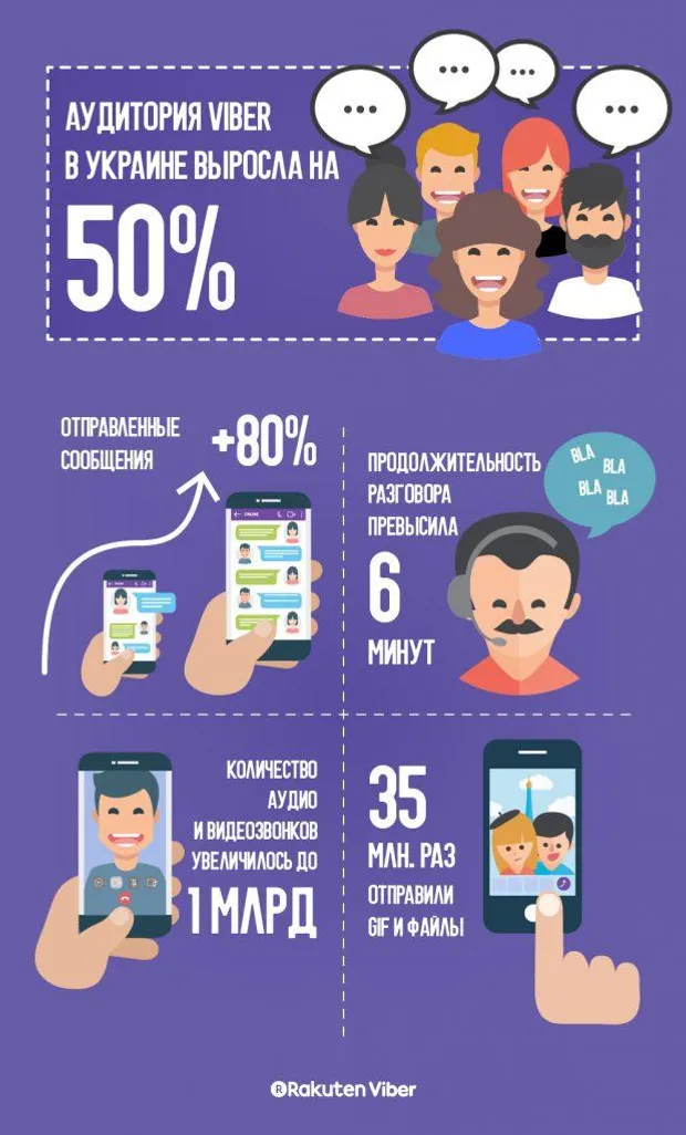 Зросла також і кількість повідомлень, які українські користувачі Viber відправили співрозмовникам з січня 2017 по січень 2018 року – до 55 мільярдів, що на 80% більше, ніж в попередньому році. Зараз месенджер є у кожного другого жителя України,
