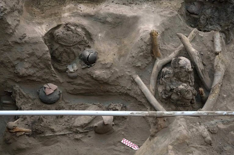 Окрім похоронних тюків, які, на думку археологів, зберігають двох дорослих і шістьох дітей (їм не більше 923 років), робітники виявили артефакти, що датуються значно новішими часами, ближчими до сьогодення: