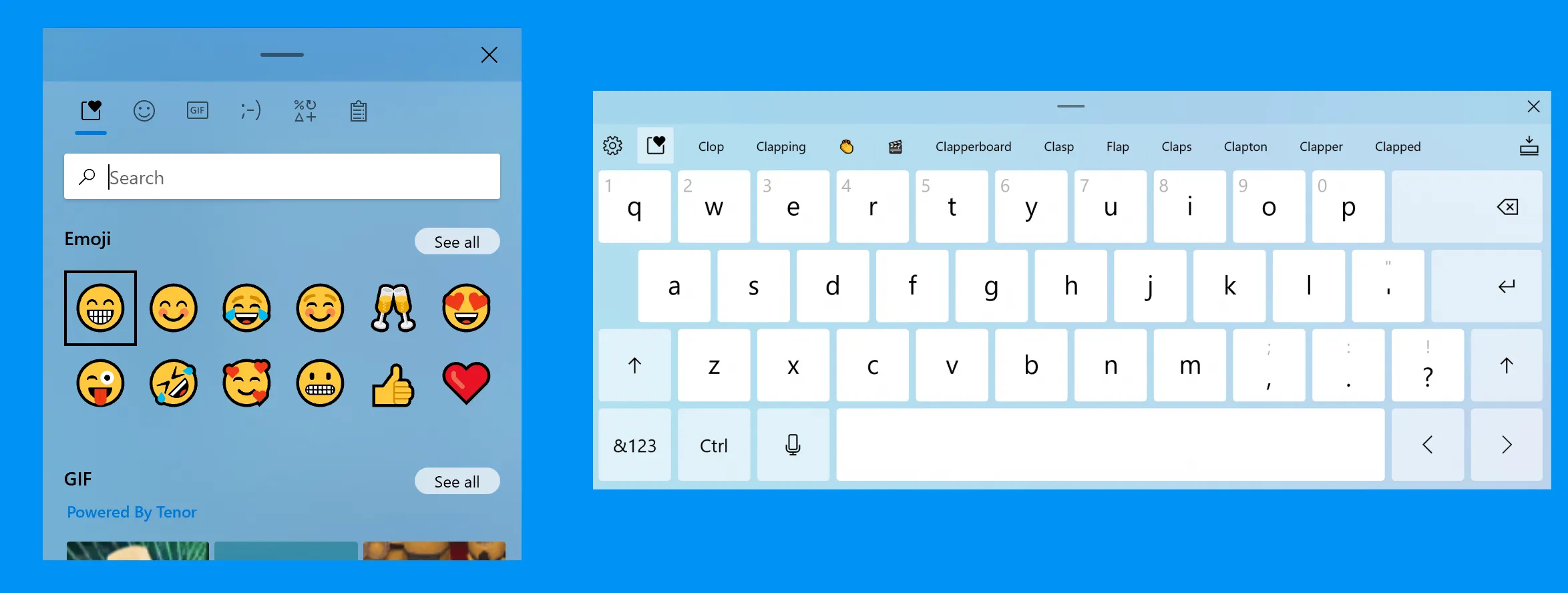 Пошуковий рядок дозволяє шукати за доступним контентом: GIF, наприклад, забираються з бази сервісу Tenor. Віртуальна клавіатура поставляється з новим візуальним оформленням Fluent Design. У неї вбудовано поле пошуку Emoji і GIF, нові анімації і звуки натискання клавіш, а також іконка запуску голосового введення.