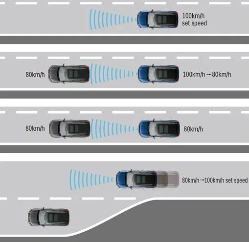 Адаптивний круїз-контроль – дуже зручна система, яка дозволяє не напружуватись під час руху на трасах. Водій виставляє максимальну швидкість, до якої може розігнатись машина, а також відстань, яку вона буде "тримати" до найближчого спереду авто. Після цього автомобіль дотримується вказаної швидкості, а якщо спереду з'являється транспортний засіб, який їде повільніше, авто пригальмує саме. Це суттєво спрощує керування машиною.
