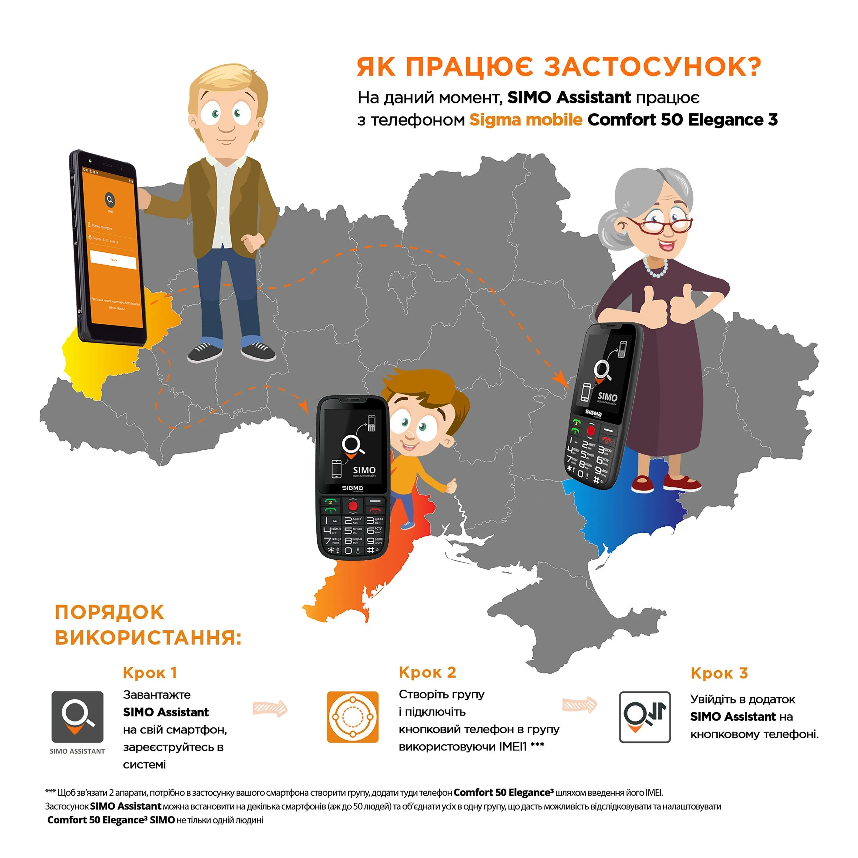 Однак родзинкою COMFORT 50 Elegance³ є спеціальна прошивка від Sigma mobile, яка в тандемі з додатком SIMO Assistant для Android та iOS перетворює пристрій на справжнього помічника. Щось схоже ви не знайдете на ринку – додаток та адаптована прошивка унікально розроблені Sigma mobile. Компанія врахувала всі побажання клієнтів, створюючи програмне забезпечення для телефона та смартфона. Додаток допоможе з легкістю налаштувати COMFORT 50 Elegance³ навіть на відстані й дізнатися геоположення члена родини.