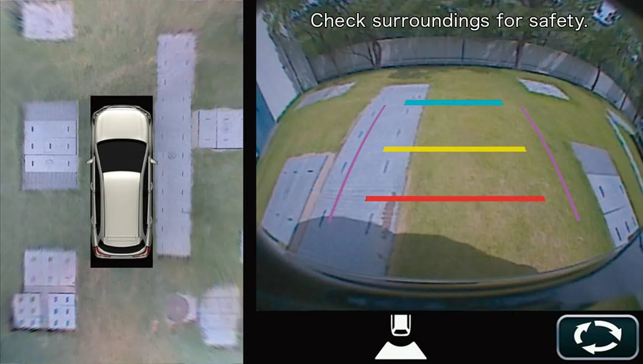 У SUZUKI S-CROSS в комплектації GLX з дев’ятидюймовим дисплеєм передбачена система з чотирьох камер (передньої, задньої та двох бокових), яка забезпечує огляд на 360 градусів. Завдяки цьому можна побачити машину нібито зверху, щоб було видно, що знаходиться біля кожного краю авто та кожного з коліс.