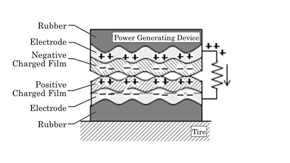 Модуль складається з двох шарів гуми, яка покрита електродами, на які з різних сторін нанесена плівка з позитивним і негативним зарядами. Коли колесо котиться по землі, пляма контакту шини деформується, створюючи статичну електрику: цей ефект відомий як "фрикційна зарядка".
