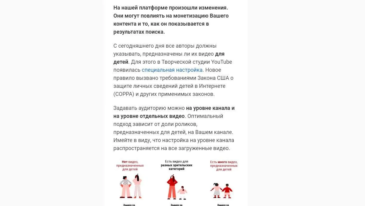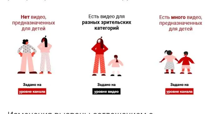 Велика частина нововведень, які торкнуться безпосередньо наповнення акаунтів контентом і реклами, припадає на користувачів, які наповнюють канали відеоматеріалами для дітей і заробляють на цьому. Адміністрація YouTube обмежила показ рекламних оголошень на таких ресурсах.