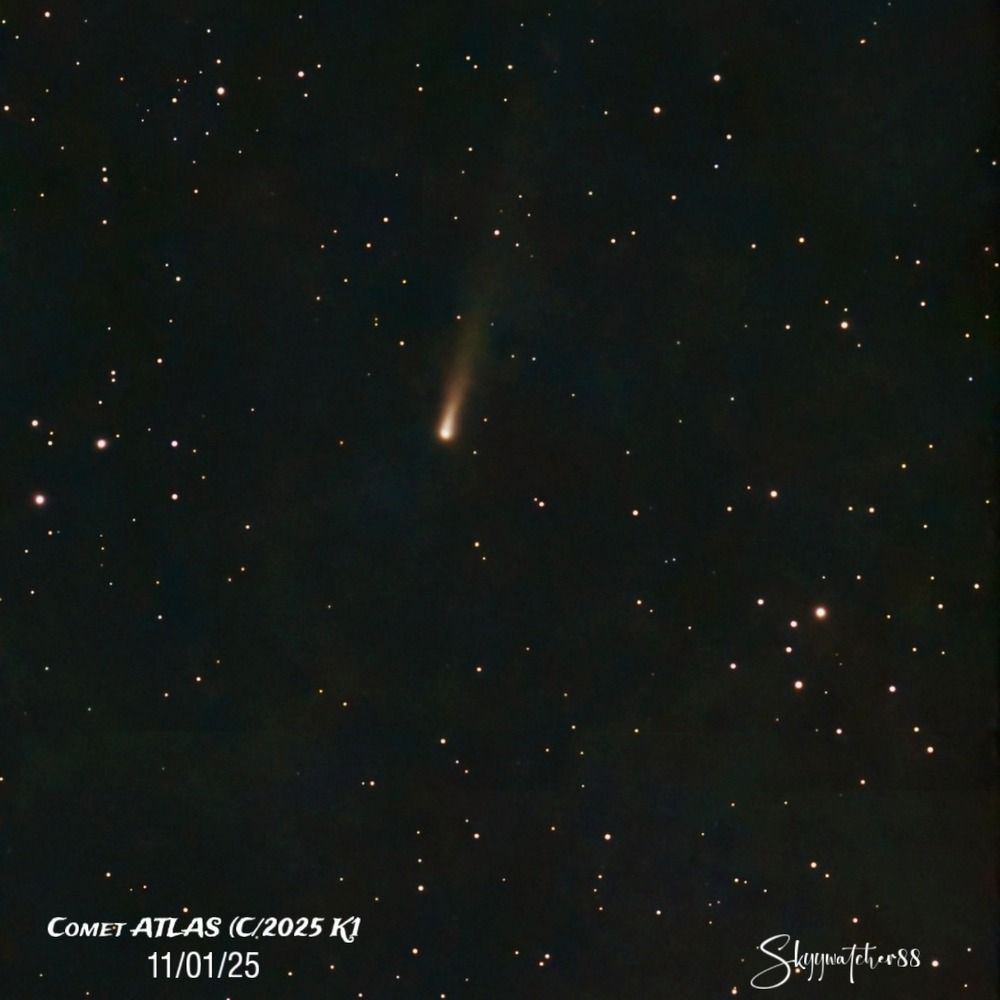 Астрофотограф Ден Бартлетт 29 жовтня зробив приголомшливий знімок C/2025 K1, на якому видно її виразне золоте сяйво та довгий хвіст, що зазнав впливу сонячного вітру. Сам фотограф зазначив, що комета не мала пережити перигелій, але вона це зробила і тепер демонструє рідкісний червоно-коричневий або золотистий колір.