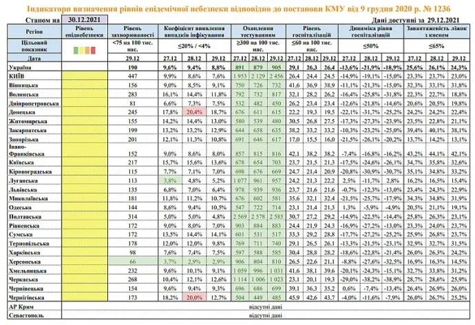З півночі 30 грудня Волинська та Запорізька області залишили червону карантинну зону та перейшли у жовту. Наразі у країні вже немає "червоних" регіонів, однак і "зелених" поки що теж.