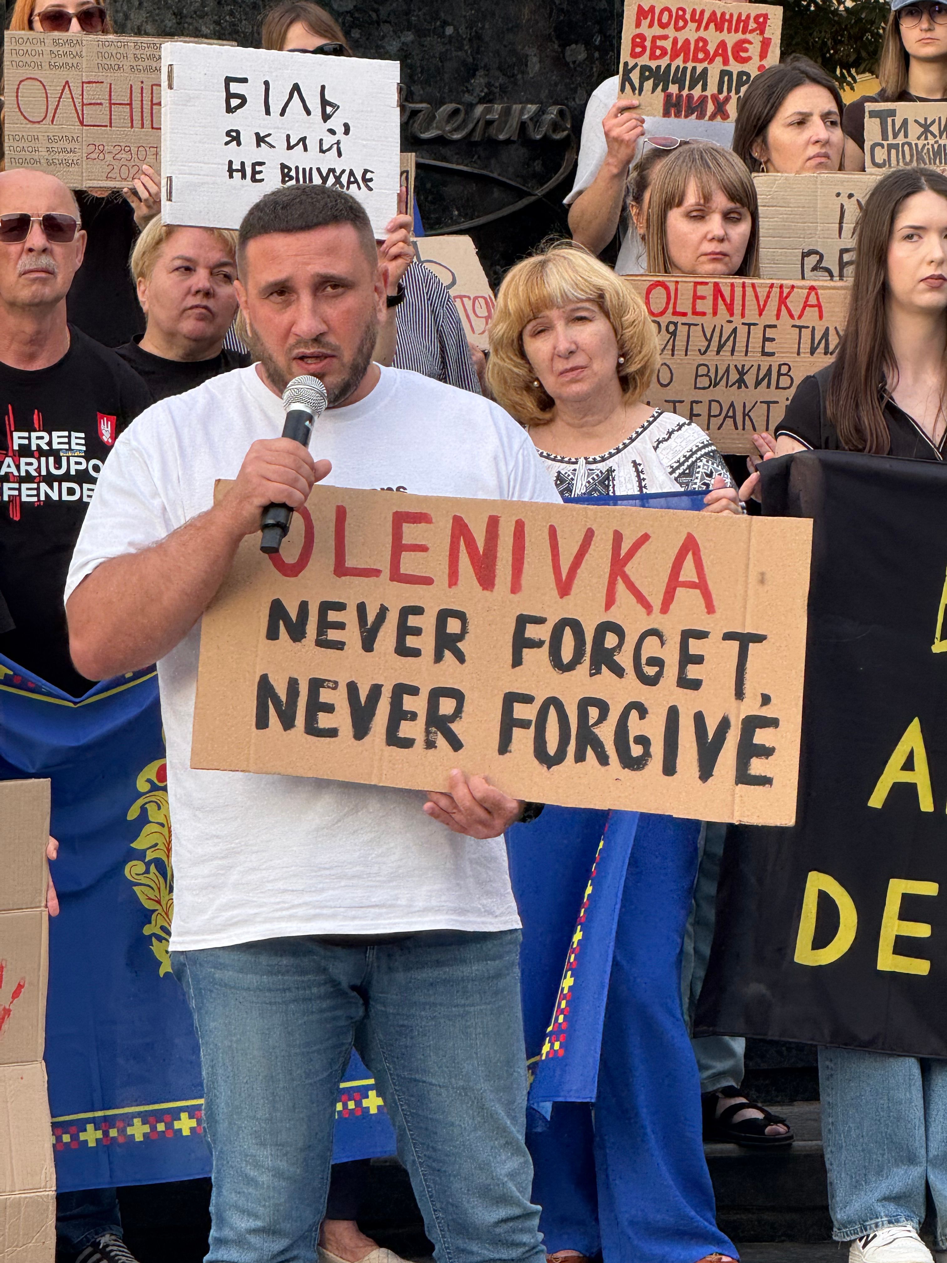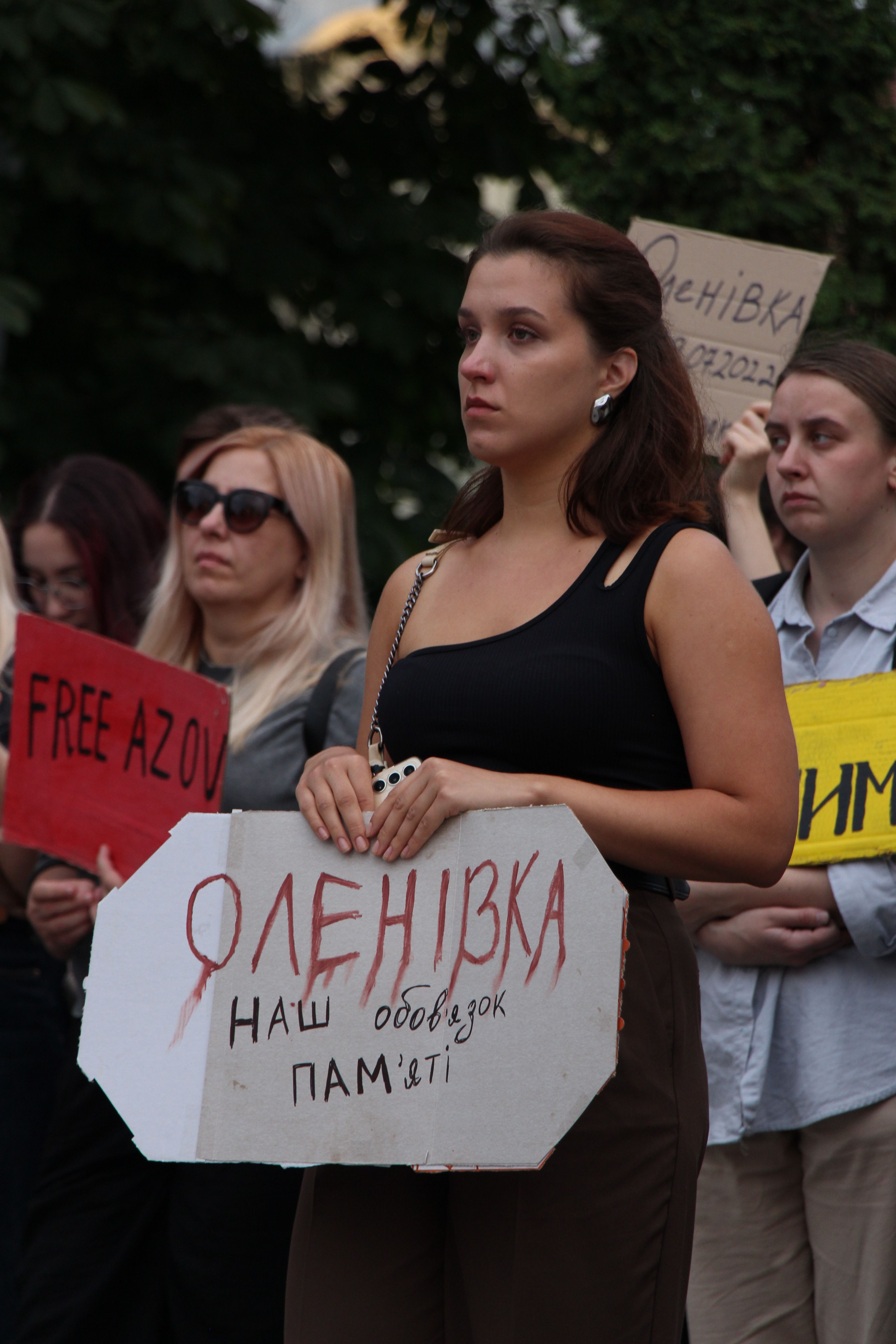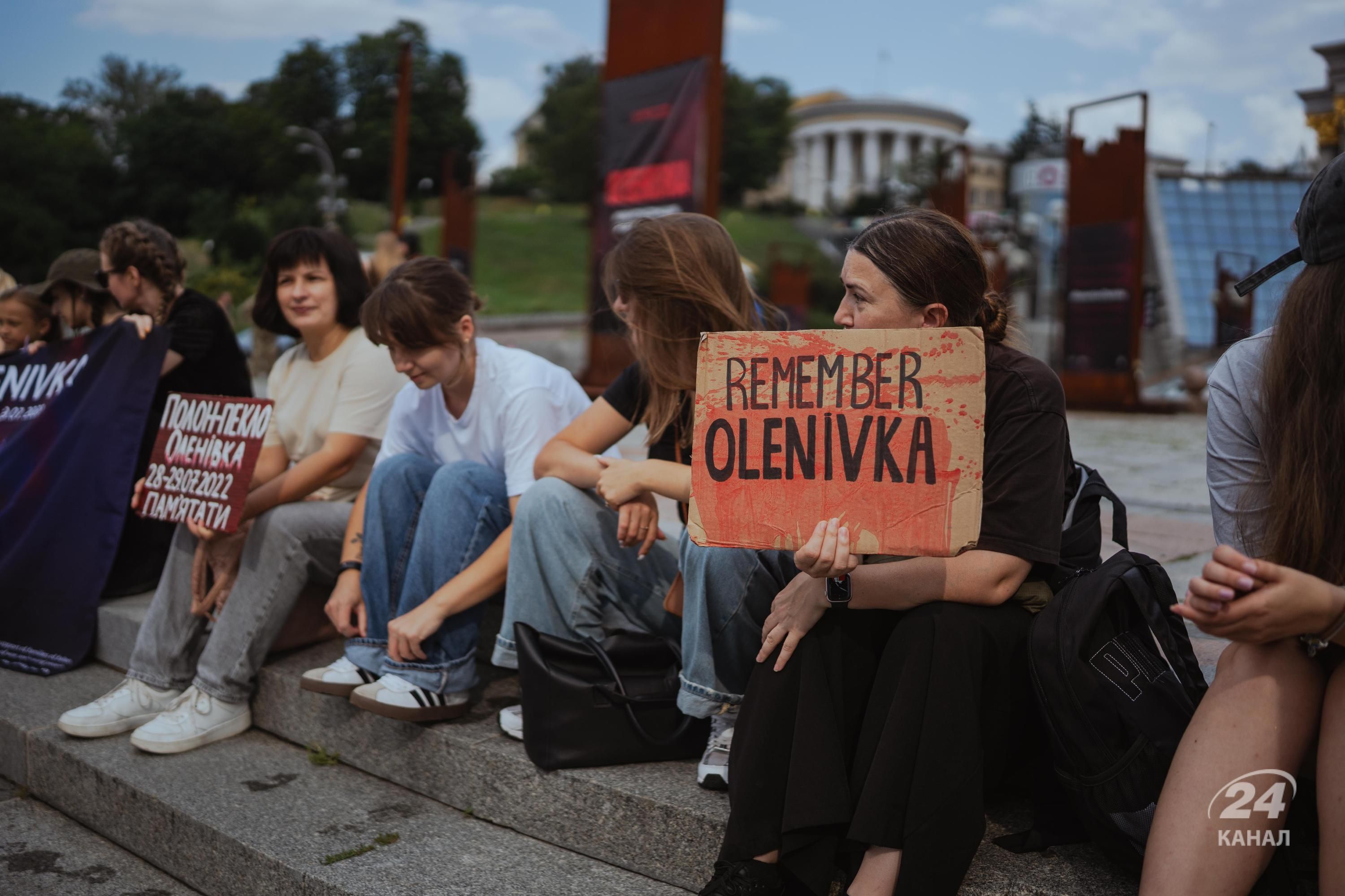 На найбільшому плакаті було написано: "28.07 – 29.07. Оленівка. Пам'ятаємо. Помстимось". На менших було зазначено: "Не мовчи про Оленівку", "Оленівка. Ті, хто вижив – в пеклі полону", "Оленівка. Ніколи не забудемо, ніколи не пробачимо" тощо.