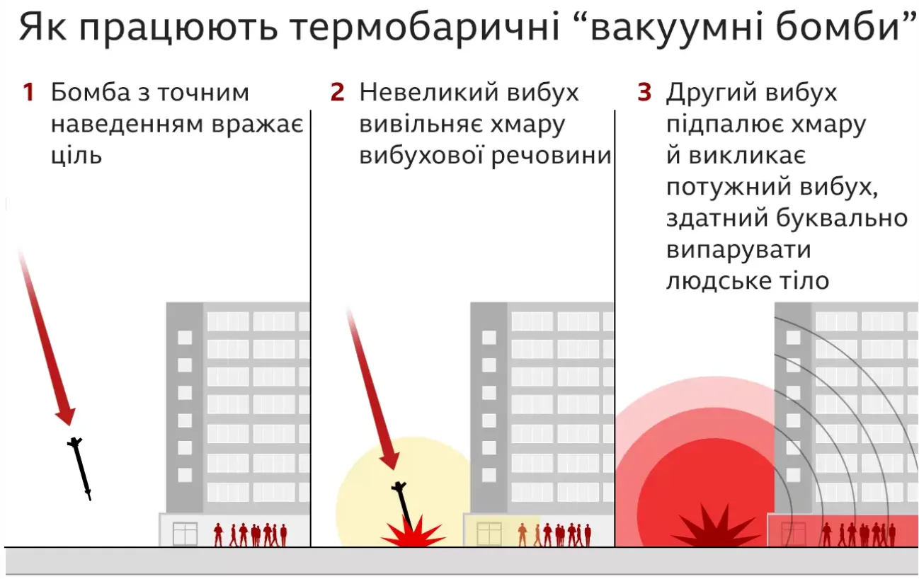 Це боєприпаси, що заповнені високотемпературною вибуховою речовиною високого тиску. Інша назва – "вакуумні бомби". Її часто використовують журналісти, хоча правильно вживати саме термобарична зброя.