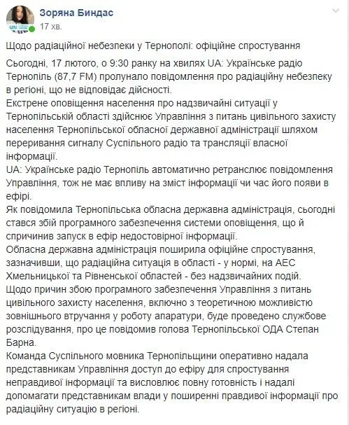 Так, тривожне повідомлення перервало ефір Українського радіо о 9:30 ранку 17 лютого. У ньому йшлося про те, що підвищений рівень радіації на Тернопільщині начебто зумовлений її витоком на одній з АЕС.