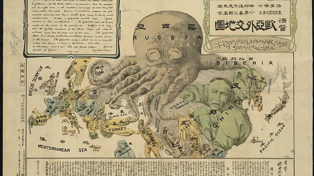 Clément Guézais у коментарях до допису опублікував зображення із "Гумористичногро атласу Європи та Азії". Карикатури під назвою "Осьминоги Європи" намалював Кісабуро Охара в 1904 році на початку російсько-японської війни. Ця картина зображає російський експансіонізм, як грізного кракенського "чорного восьминога". З іншого боку, карта також чітко виражає японські імперські наміри. Англійці сміливо вважали, що японці могли цілком просунутися до Санкт-Петербурга.
