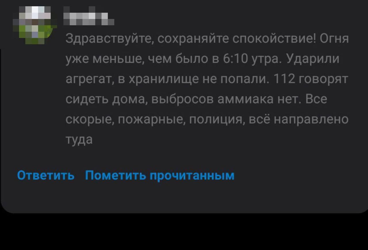 У мережі пишуть, що мешканців міста закликали сидіти вдома. Водночас зазначають і те, що нібито було влучання в агрегат, а не сховище, і викидів аміаку немає.