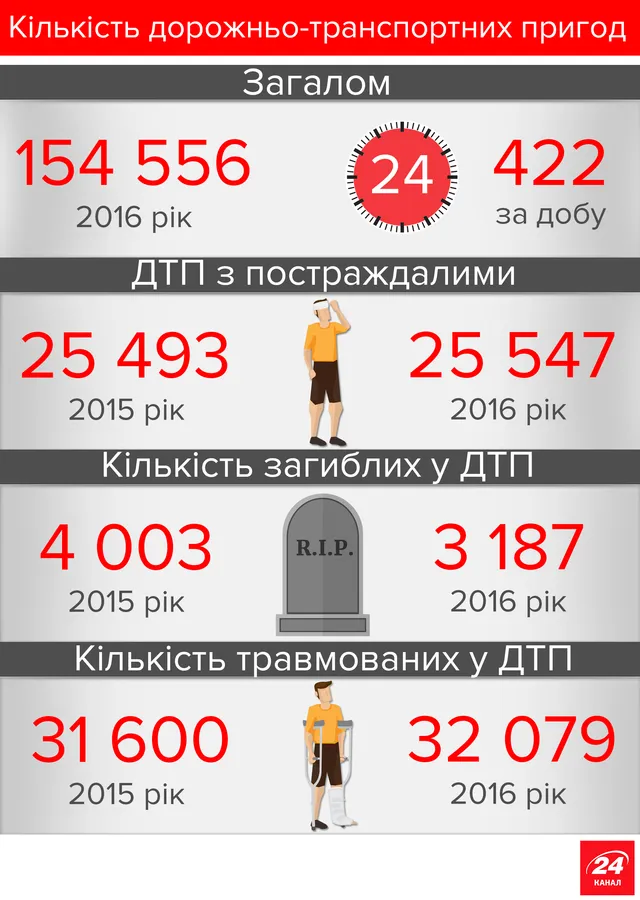 Як випливає з даних, незважаючи на суттєвий ріст загальної кількості ДТП, випадків, у яких постраждали люди, майже не побільшало – 25 547 проти 25 493 у 2015-му. Більше того, кількість загиблих у дорожньо-транспортних пригодах, зменшилась з 4 до майже 3,2 тисячі.