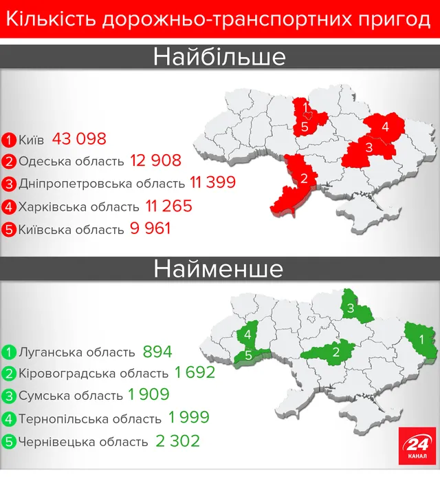 "Лідером" за кількістю ДТП, очікувано, є Київ – кожна четверта аварія траплялась саме у столиці. Найменше ж ДТП зафіксовано на Луганщині.