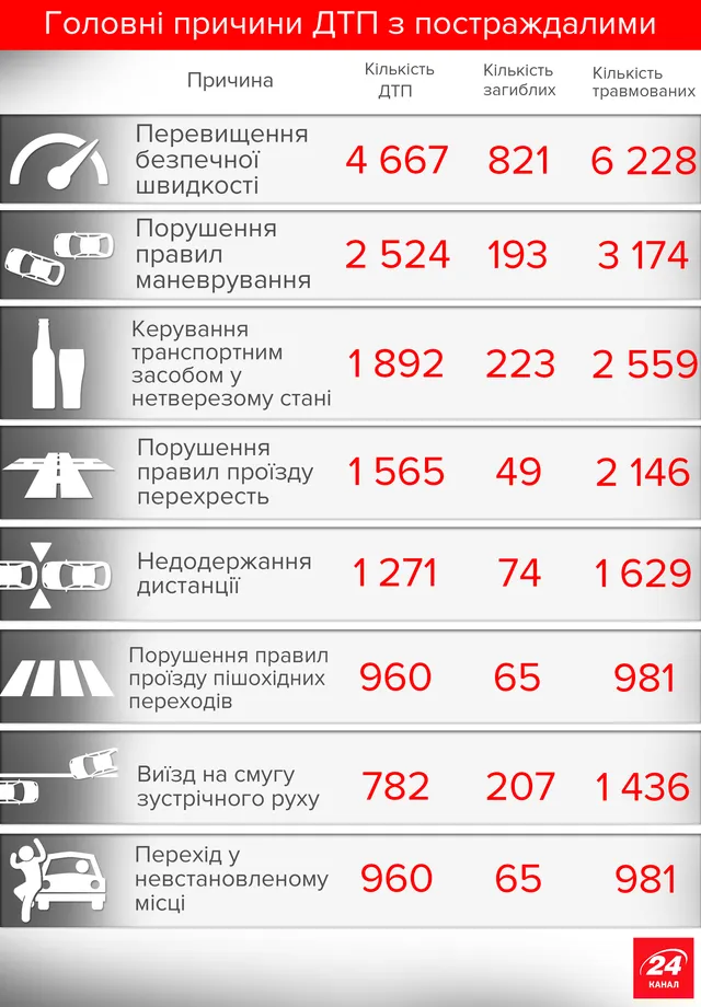 Головними причинами ДТП, як і минулого року, залишається перевищення безпечної швидкості, порушення правила маневрування та водіння у нетверезому стані.
