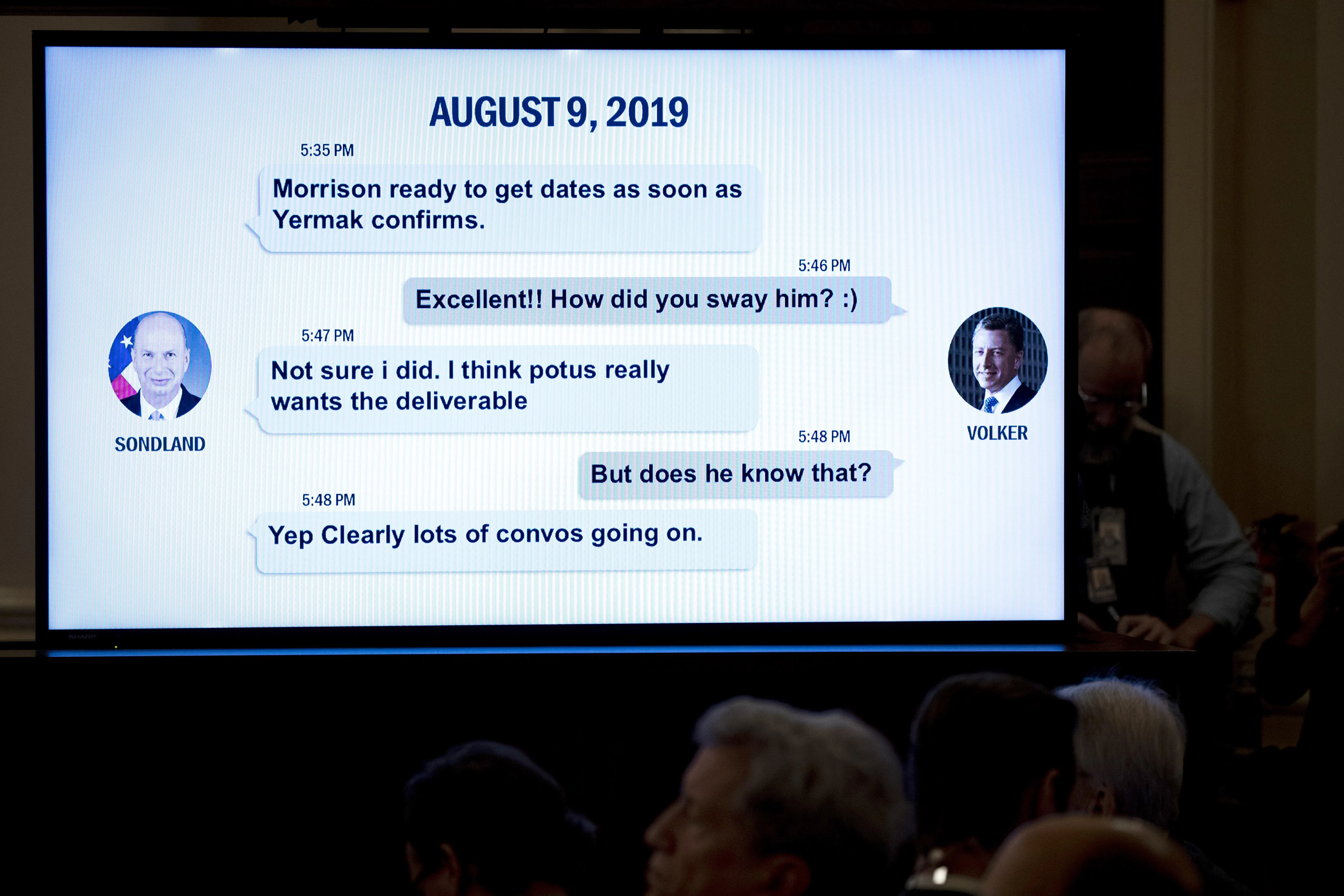 - Голови трьох Комітетів Конгресу відзначили, що "якщо Україну змушують обирати між захистом від Росії без допомоги з боку США і використанням її юридичної системи для кампанії Трампа, це може означати приголомшливе зловживання владою, добру справу для Москви та зраду народної довіри"; Також, Посол Тейлор написав Послу Сандленду, що "це божевілля – затримувати військову допомогу у обмін на допомогу з політичною кампанією. Росіяни люблять таке";