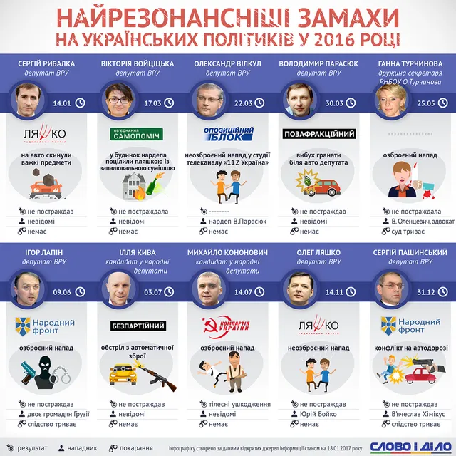 Минулорі ризиковані пригоди представників українського політикуму почалися з "радикала" Сергія Рибалки. На його авто 14 січня невідомі скинули важкі предмети. Також 17 березня хтось кинув у будинок народного депутата від "Самопомочі" Вікторії Войціцької пляшку із займистою сумішшю, 30 березня біля авто Володимира Параска вибухнула граната.